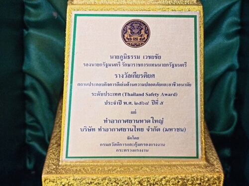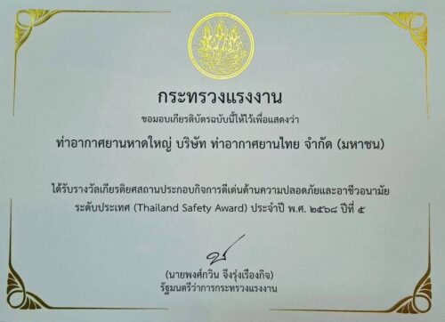 ท่าอากาศยานหาดใหญ่ ( ทหญ.) รับรางวัลเกียรติยศสถานประกอบกิจการดีเด่นด้านความปลอดภัยและอาชีวอนามัย ระดับประเทศ (Thailand Safety Award) ประจำปี 2568 ปีที่ 5