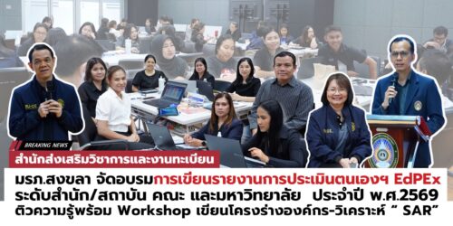 สำนักส่งเสริมวิชาการและงานทะเบียน มรภ.สงขลา จัดอบรมการเขียนรายงานการประเมินตนเองตามเกณฑ์คุณภาพการศึกษาเพื่อการดำเนินการที่เป็นเลิศ “EdPEx” ระดับสำนัก/สถาบัน คณะ และมหาวิทยาลัย ประจำปี พ.ศ.2569 เทียบเชิญวิทยากรเติมเต็มความรู้บุคลากร พร้อมฝึกปฏิบัติเขียนโครงร่างองค์กร การวิเคราะห์รายงานการประเมินตนเอง (SAR)