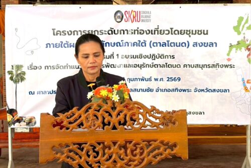 เมื่อวันที่ 12 กุมภาพันธ์ 2569 สถาบันวิจัยและพัฒนา มหาวิทยาลัยราชภัฏสงขลา (มรภ.สงขลา) ลงพื้นที่จัดโครงการอบรมเชิงปฏิบัติการ เรื่อง “การจัดทำแนวทางการพัฒนาและอนุรักษ์ตาลโตนด คาบสมุทรสทิงพระ” ณ วัดประดิษฐ์สโมสร (วัดสนามชัยออก) ตำบลสนามชัย อำเภอสทิงพระ จังหวัดสงขลา โดย ผศ.พิเชษฐ์ จันทวี อธิการบดี มรภ.สงขลา ได้มอบหมายให้ รศ.ดร.วีระชัย แสงฉาย รองอธิการบดีฝ่ายวิชาการและวิจัย เป็นประธานกล่าวเปิดงาน พร้อมเน้นย้ำบทบาทของมหาวิทยาลัยในการบูรณาการองค์ความรู้ด้านวิชาการ งานวิจัย และการบริการวิชาการ เพื่อสนับสนุนการอนุรักษ์และต่อยอดภูมิปัญญาท้องถิ่นให้เกิดคุณค่าทางเศรษฐกิจ สังคม และวัฒนธรรม ควบคู่กับการดูแลทรัพยากรธรรมชาติอย่างสมดุล