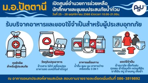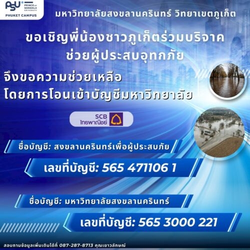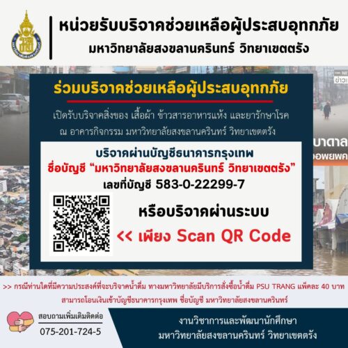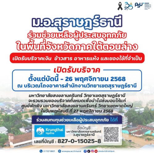 จากสถานการณ์อุทกภัยหนักในภาคใต้ โดยเฉพาะพื้นที่อำเภอหาดใหญ่ จังหวัดสงขลา และพื้นที่ใกล้เคียง ส่งผลให้มีผู้ได้รับผลกระทบจำนวนมากต้องอพยพออกจากบ้านเรือน เพื่อหลีกเลี่ยงความเสี่ยงจากน้ำท่วม คณะผู้บริหารบุคลากร และนักศึกษา จาก 5 วิทยาเขตของมหาวิทยาลัยสงขลานครินทร์ รวมถึงเครือข่ายพันธมิตร จึงระดมกำลังดำเนินงานให้ความช่วยเหลืออย่างเร่งด่วนและต่อเนื่อง