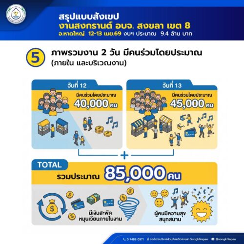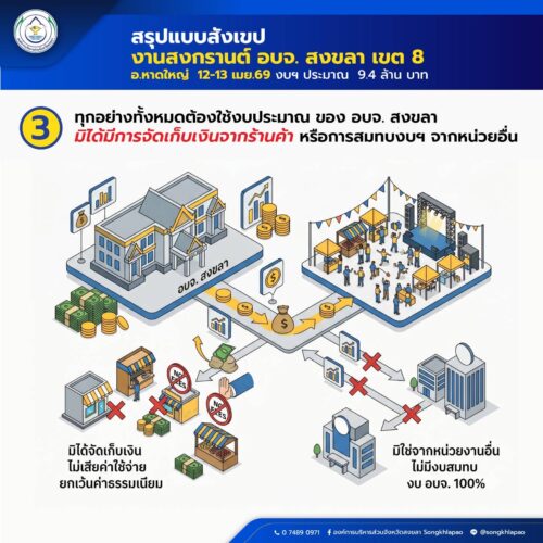 3. ทุกอย่างทั้งหมดต้องใช้งบประมาณ ของ อบจ. สงขลา มิได้มีการจัดเก็บเงินจากร้านค้า หรือการสมทบงบฯ จากหน่วยอื่น