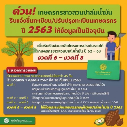 เกษตรกรชาวสวนปาล์มรีบแจ้งขึ้นทะเบียน/ปรับปรุงทะเบียนเกษตรกร เพื่อรับเงินช่วยเหลือโครงการฯ งวดที่ 6 – 8 ภายในวันที่ 24 เม.ย. นี้