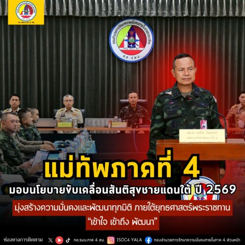 แม่ทัพภาคที่ 4 มอบนโยบายขับเคลื่อนสันติสุขชายแดนใต้ ปี 2569 มุ่งสร้างความมั่นคงและพัฒนาทุกมิติ ภายใต้ยุทธศาสตร์พระราชทาน “เข้าใจ เข้าถึง พัฒนา”